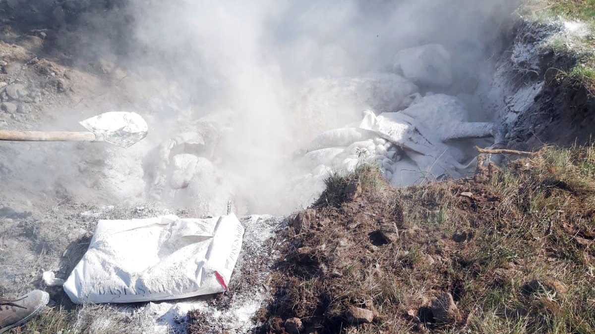 Özkan çiftinin ihbarı üzerine köye gelen İlçe Tarım Müdürlüğü ekiplerinin nezaretinde ölen hayvanlar iş makinesiyle açılan çukura gömüldü.