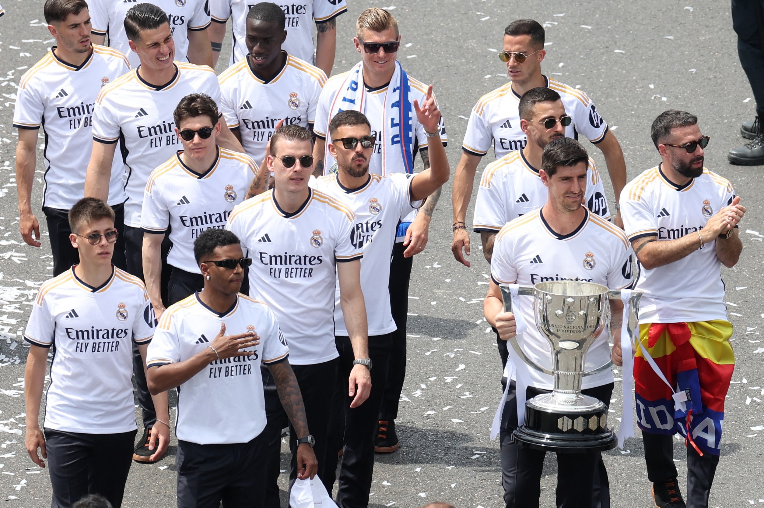 Bu sezon İspanya Süper Kupası’ndan sonra lig şampiyonluğunu da kazanan Real Madrid’in kent merkezindeki kutlamalarını binlerce taraftarı izledi.