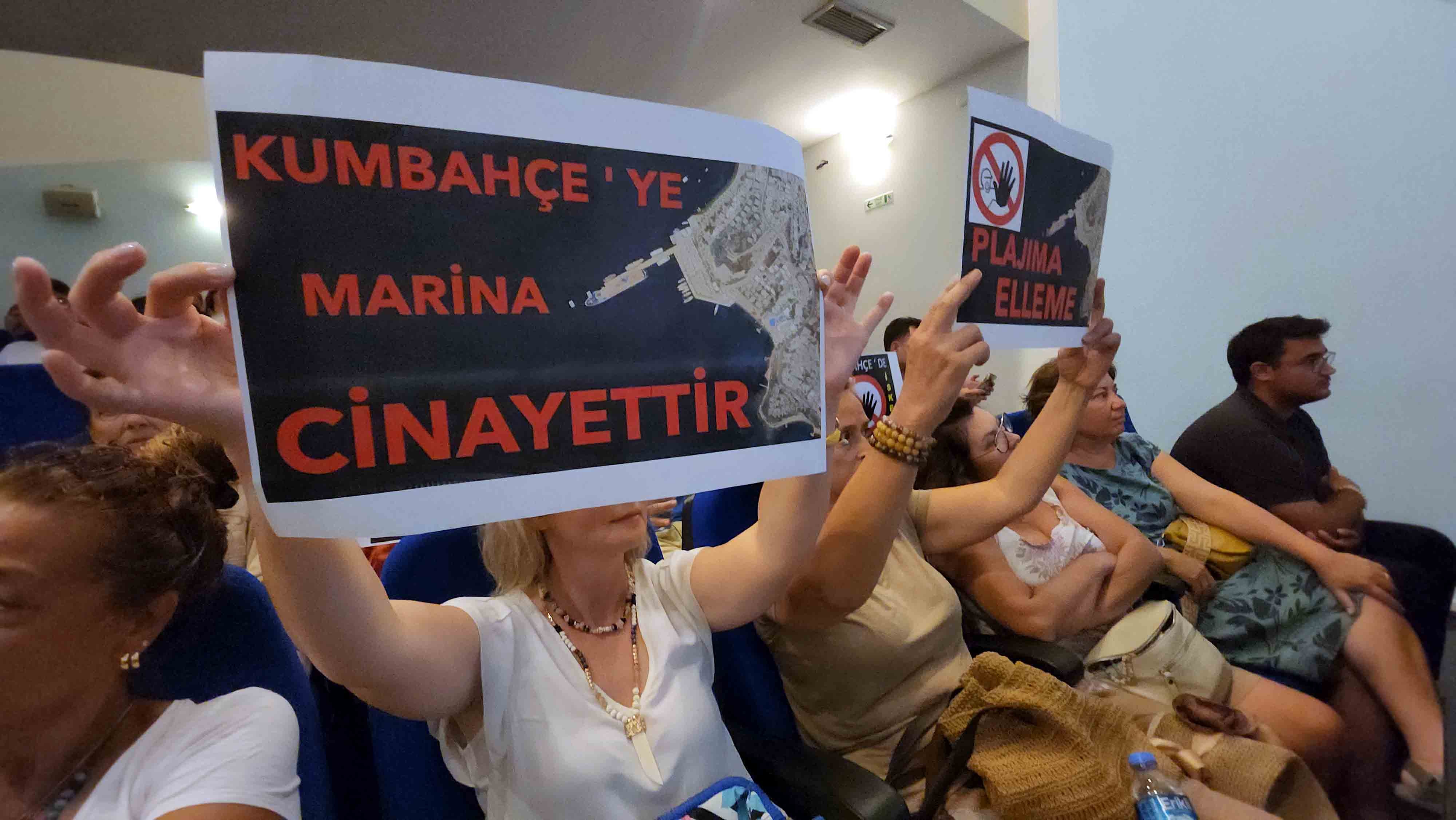Çevre Şehircilik ve İklim Değişikliği il Müdürlüğü memurları ÇED raporunu hazırlayan şirket temsilcilerinin sunumu ile başlayan başında toplantıya katılan 20 STK temsilcisi, vatandaşlar, kaptanlar, turizmciler ve halk “Kumbahçe’de marina istemiyoruz” Kumbahçe’de marina cinayettir”, Kumbahçe’de iskele istemiyoruz” “Halkın plajlarına Marina istemiyoruz” yazılı dövizler açtı, alkışlar ve yuhalamalarla toplantıyı protesto etti.