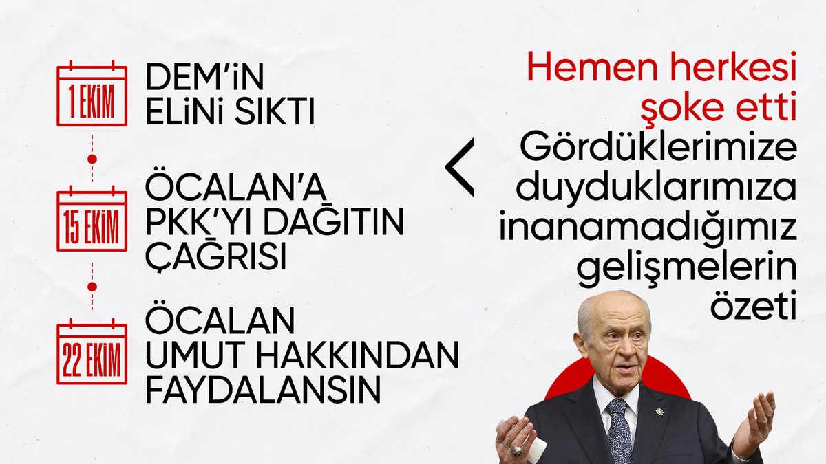 İlk olarak Öcalan’ın tecridinin kalkması durumunda TBMM’ye gelip DEM Grubu’nda konuşarak terör örgütünün lağvedildiğini ilan etmesi çağrısında bulunan Bahçeli’nin, tarihe geçecek ifadeleri şöyle;