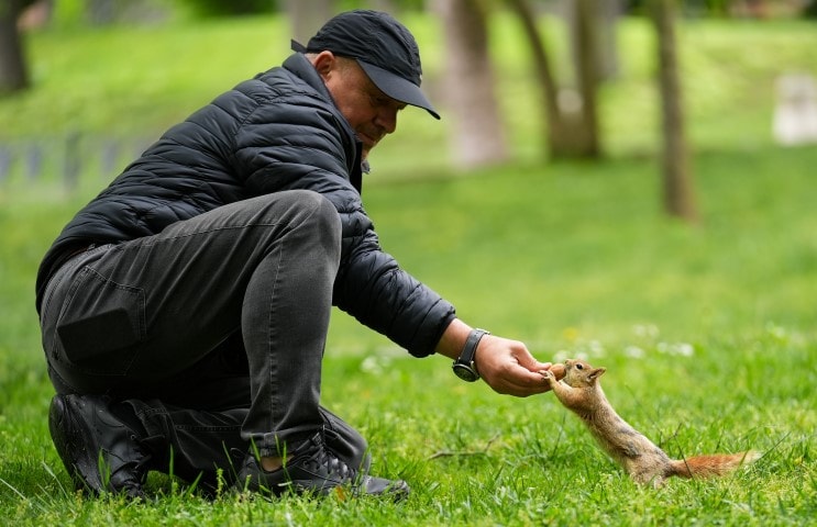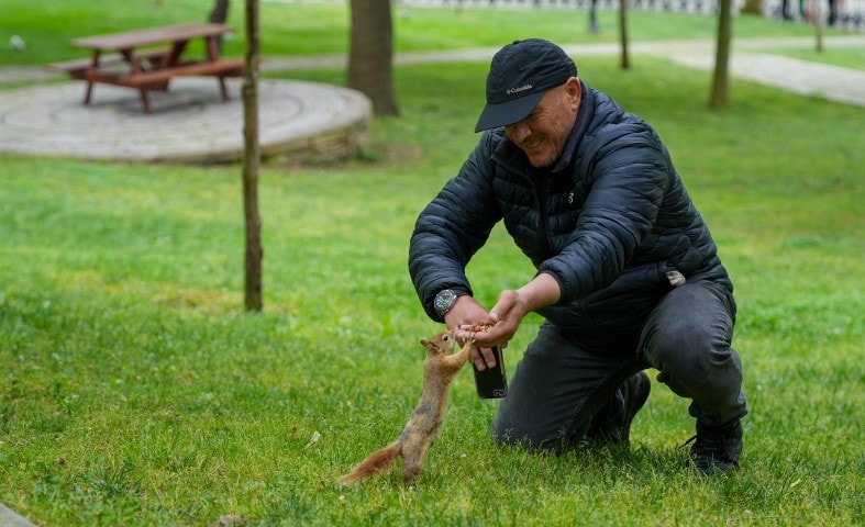 Koruyu ziyaret eden diğer vatandaş ve turistler de sincapları besleyen Sandıkcı’yı görünce cep telefonlarına sarılıp kayıt yaptı.