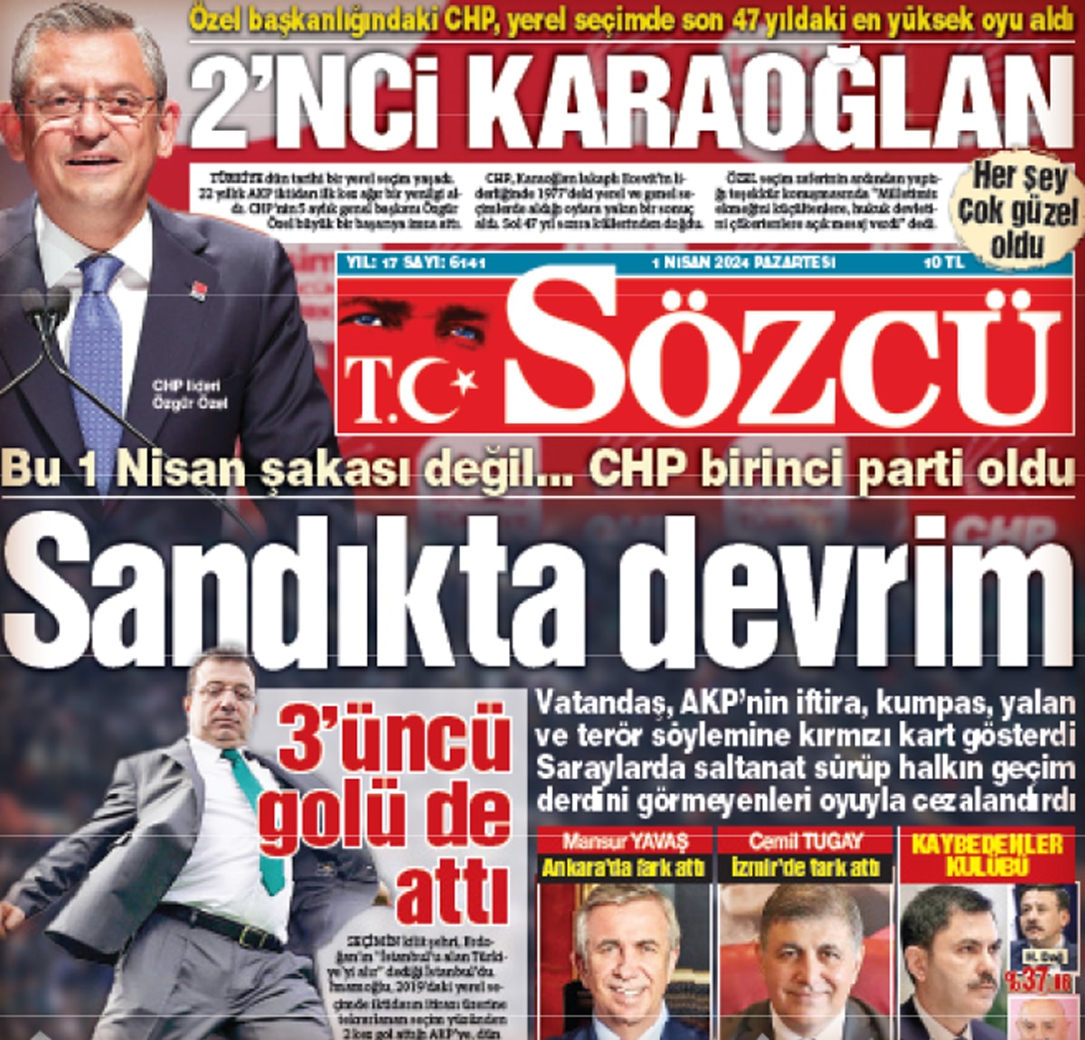 SÖZCÜ’nün seçimin ertesi günü attığı “İkinci Karaoğlan” başlığı çok gurur verici. İnşallah Bülent Ecevit Başkanımızın 1970’lerde yaptıklarına yaklaşabilir, partimizi, Mustafa Kemal Atatürk’ün partisini, yerelde iktidar yaptıktan sonra merkezi yönetimde de iktidara taşıyabiliriz.