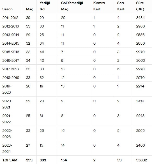 Tecrübeli kalecinin Galatasaray formasıyla sezonlara göre Süper Lig’de yediği gol sayıları ve maç başı ortalamaları şöyle: