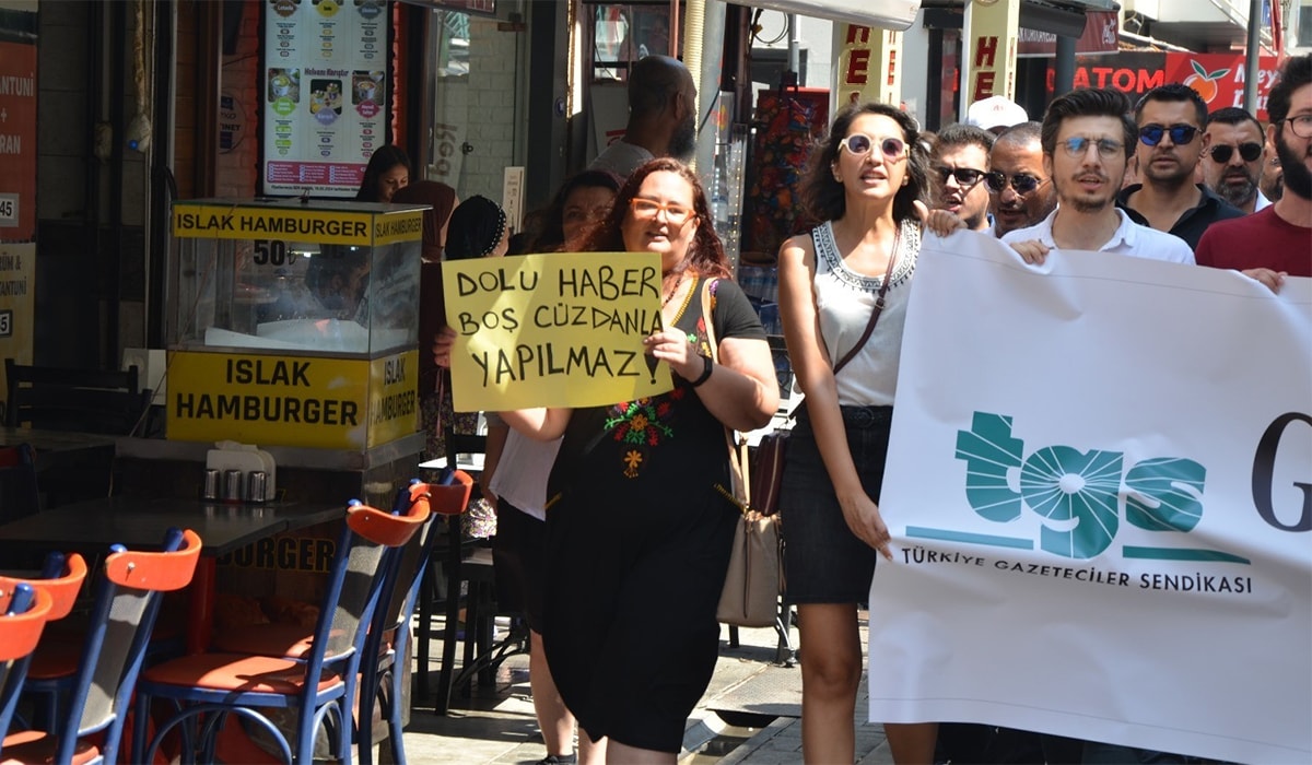 Eyleme, TGS İzmir Şube Başkanı Nil Kahramanoğlu’nun yanı sıra eski CHP İzmir Milletvekili ve eski İzmir Gazeteciler Cemiyeti Başkanı Atila Sertel, eski CHP Milletvekili Musa Çam ve sendika temsilcileri de katılarak gazetecilere destek verdi.