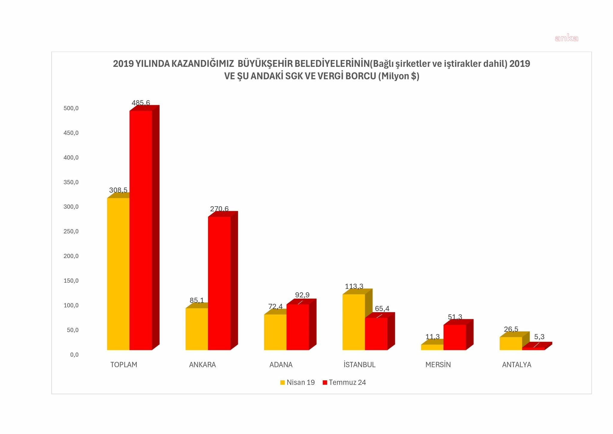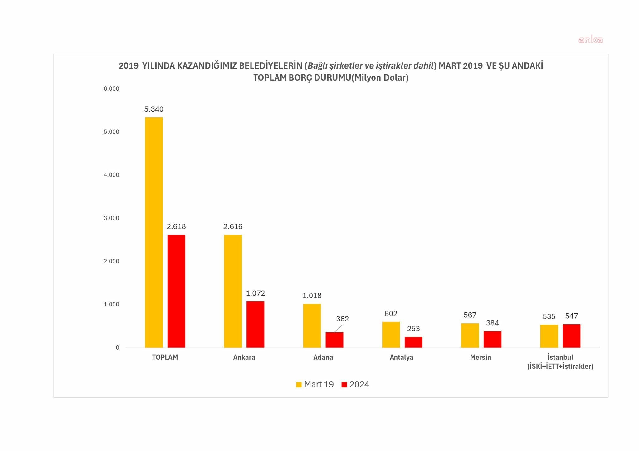 Bugün bu belediyelerin borçlarının toplamı 2,6 milyar dolara kadar düşmüş durumda. örneğin Ankara Büyükşehir Belediyesi’ni 2,6 milyar dolar borçla aldık, haziran 2024 sonu itibarıyla Ankara Büyükşehir Belediyesi’nin bağlı şirketleri ve iştirakleri de dahil toplam borcu 1,1 milyar dolara kadar düştü. Aynısını Adana da yaptı, Antalya da yaptı, Mersin de yaptı. İstanbul Büyükşehir Belediyesi’ne bağlı İSKİ, İETT iştiraklerinin 2019 yılında 535 milyon dolar olan borcu şimdi 547 milyon dolara çıkmış gözüküyor. Onca hizmete karşılık sadece 12 milyon dolarlık bir artış yaşanmış. 2019 yılında kazandığımız 5 büyükşehir belediyesinin vergi ve sigorta borçlarında bir artış yaşandı. Ancak bu artış, bu belediyelerimizin toplam borcunda yaşanan azalışın yanında devede kulak kalır. Türkiye 2019 yılından bu yana kesintisiz olarak ve giderek derinleşen bir şekilde büyük bir ekonomik krizin içerisinden geçmektedir. Bu dönemde, döviz kurları, enflasyon, faiz oranları yükseldi. İktidar 2019 yılında kaybettiği belediyelerin başta kamu bankaları olmak üzere yurt içinden ve yurt dışından borçlanmasını engelledi. 2020 ve 2021 yıllarında yaşanan pandemi döneminde belediyelerimizin gelirleri azaldı, giderleri ise olağanüstü bir şekilde arttı.