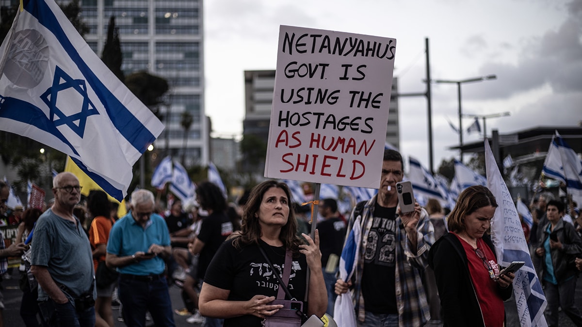 Esirlerin bir an önce evlerine dönmesi çağrısı yaparak davullar ve düdükler çalan protestocular, “Hepsi hemen eve!”, “Yardım!” yazılı dövizler taşıdı, Netanyahu’yu suçlayan sloganlar attı. Göstericiler, “(Netanyahu) Bibi esirleri serbest bırak!”, “Sen baştasın, sen suçlusun” diye bağırdı.