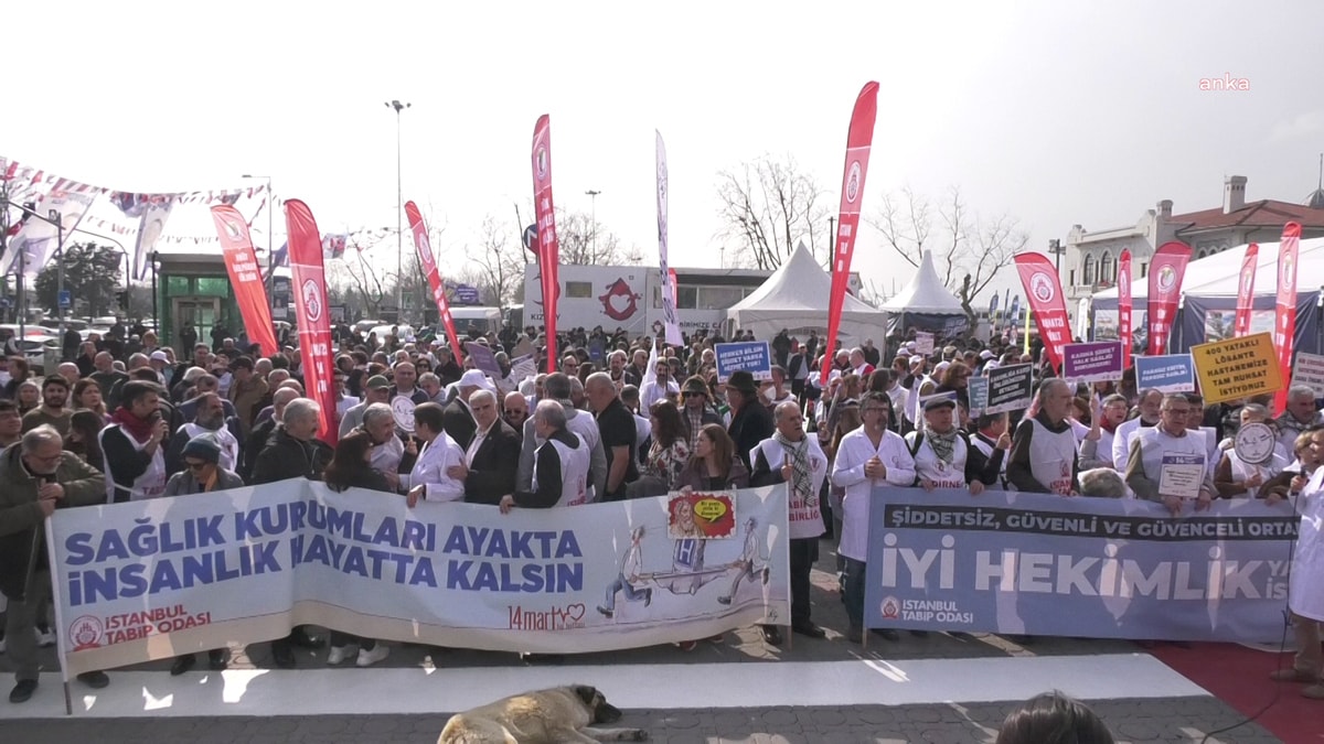 Kadıköy Haydarpaşa Numune Eğitim ve Araştırma Hastanesi önünde toplanarak yürüyüşe geçen hekimler, “İnsanca yaşamak, yaşatmak istiyoruz”, “Hak hukuk adalet”, “Sarayın hekimi olmayacağız” sloganları attı.