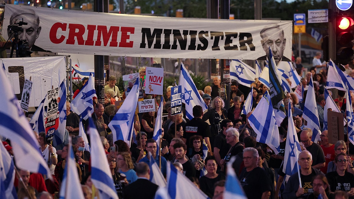 İsrail bayrakları taşıyan binlerce protestocu, Başbakan Netanyahu ve hükümetindeki siyasetçiler aleyhinde pankart, afiş ve dövizler taşıdı, caddede kurulan platformda hükümeti eleştiren konuşmalar yapıldı.