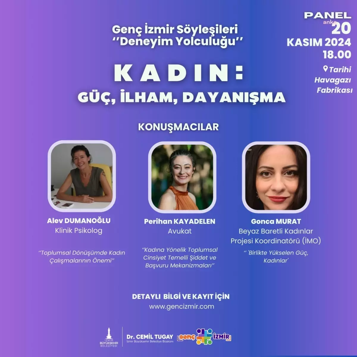 Kent genelinde hayata geçirilen projelerle gençlerin fırsat eşitliği gözetilerek sosyal yaşamın temel gereksinimlerinden yoksun kalmaması için çalışan İzmir Büyükşehir Belediyesi ilgi çekici etkinliklere imza atıyor. Bu kapsamda “Genç İzmir Söyleşileri Deneyim Yolculuğu Programı” başlığıyla her ay düzenlenen etkinlikler dizisinin bu ayki teması; “Kadın: Güç, İlham, Dayanışma” olarak belirlendi.