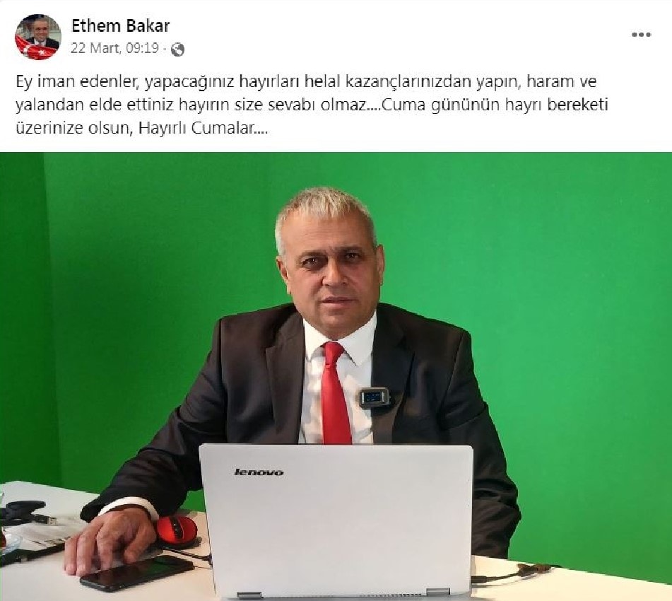 Tutuklananlardan Ethem Bakar’ın, sosyal medya hesabından dürüstlük ve helal kazancın önemine değinerek cuma günü kutlama paylaşımı yaptığı ortaya çıktı. Bakar, kendi fotoğrafıyla yaptığı paylaşımda “Ey iman edenler, yapacağınız hayırları helal kazançlarınızdan yapın, haram ve yalandan elde ettiğiniz hayrın size sevabı olmaz. Cuma gününün hayrı bereketi üzerinize olsun, hayırlı cumalar” ifadelerinde bulundu.