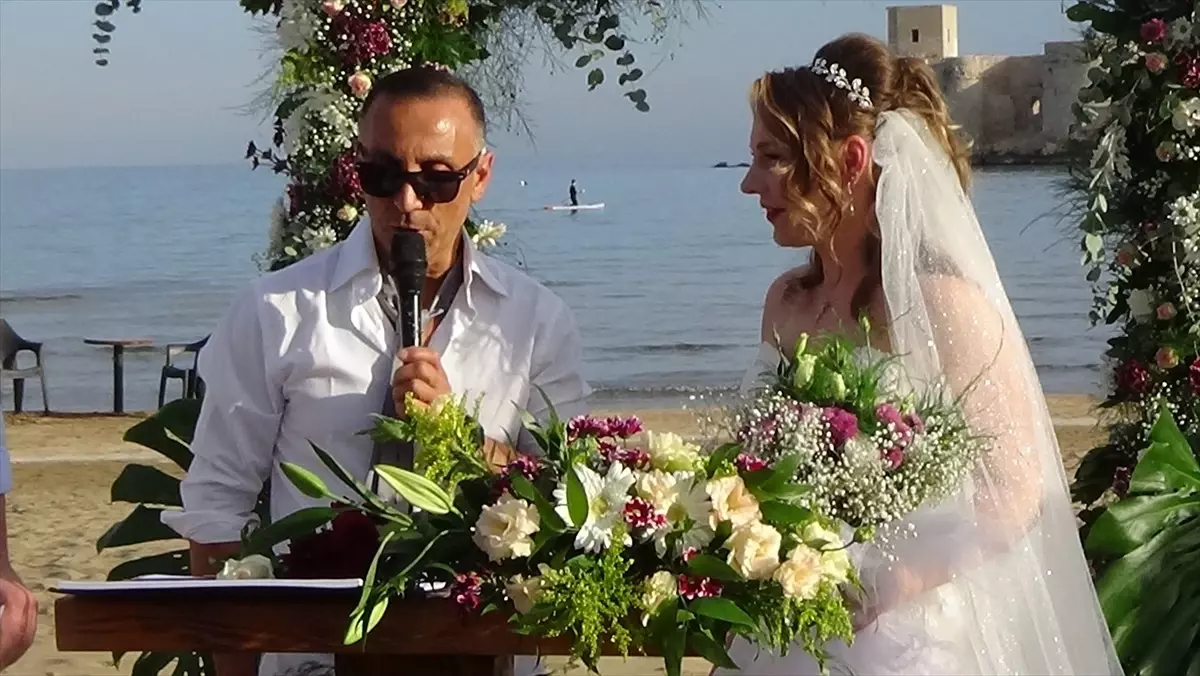 Gelinlik giyen Alman kadın, sahilde kıyılan temsili nikahta kocasına “evet” demenin heyecanını yaşadı.