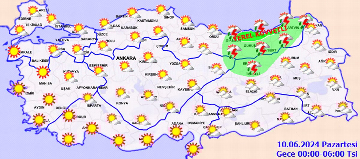 Meteoroloji Genel Müdürlüğü (MGM) tarafından yapılan son değerlendirmelere göre, ülkenin kuzey ve doğu kesimlerinin parçalı ve yer yer çok bulutlu, Doğu Karadeniz, (Malatya hariç) Doğu Anadolu ile Giresun, Diyarbakır, Batman ve Siirt çevrelerinin yerel sağanak ve gök gürültülü sağanak yağışlı, diğer yerlerin az bulutlu ve açık geçeceği tahmin ediliyor. Yağışların; Doğu Karadeniz ile Doğu Anadolu’nun kuzeyinde yerel kuvvetli olması bekleniyor.