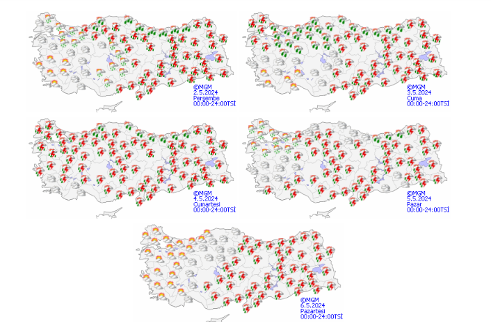 Meteoroloji Genel Müdürlüğü tarafından yapılan son değerlendirmelere göre: Ülkemiz genelinin parçalı, yer yer çok bulutlu, Marmara’nın kuzey ve doğusu, Batı Akdeniz’in iç kesimleri, Doğu Akdeniz, İç Anadolu, Karadeniz, Doğu ve Güneydoğu Anadolu bölgeleri ile Çanakkale’nin doğusu, Kütahya, Afyonkarahisar ve Denizli’nin doğu çevrelerinin yerel olmak üzere sağanak ve gök gürültülü sağanak yağışlı geçeceği tahmin ediliyor. Yağışların; Doğu Akdeniz, Orta Akdeniz’in iç kesimleri, İç Anadolu, Batı Karadeniz, Orta Karadeniz’in iç kesimleri ile Gaziantep, Kilis ve Adıyaman çevrelerinde yer yer kuvvetli olması bekleniyor. Doğu Akdeniz’in doğusu ile Güneydoğu Anadolu’da toz taşınımı beklenmektedir.