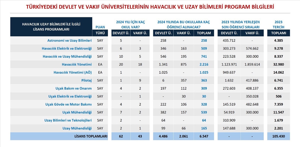Pilotaj bölümü devlette sadece Eskişehir Teknik Üniversitesi Havacılık ve Uzay Bilimleri Fakültesi’nde var. Bu yıl 5’inci kez ve yine 6 öğrenci alacak. 44 öğrenci sayısı 50’ye çıkacak. Bölüme giren en yüksek öğrencinin sıralaması 725 ve en düşük 1632 oldu. Puanı ise en düşük 533, en yüksek 545.