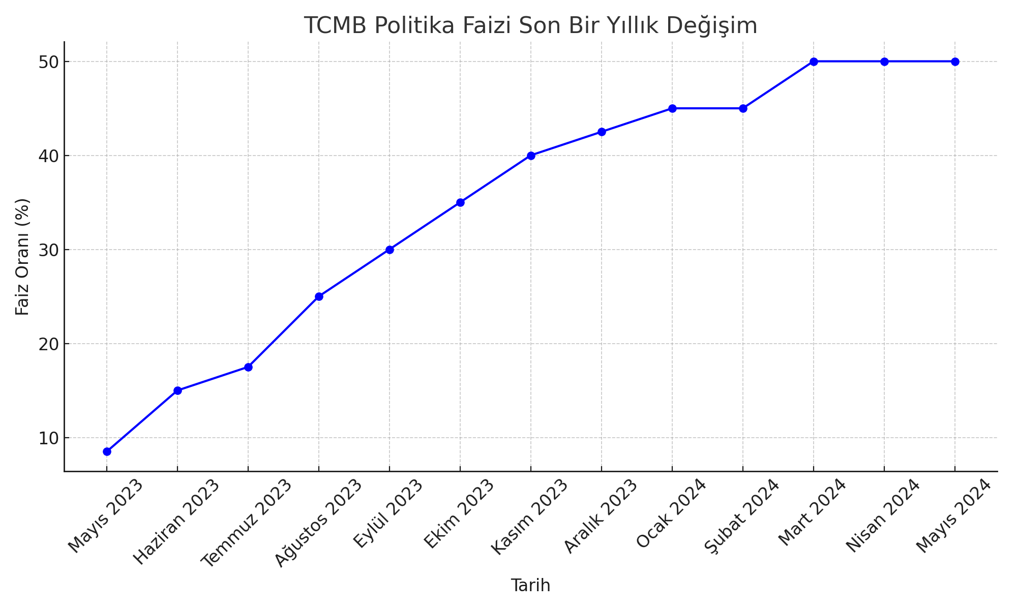 TCMB haziranda 650 baz puan, temmuzda 250 baz puan, ağustosta 750 baz puan, eylül, ekim ve kasımda 500'er baz puan, aralıkta 250 baz puan, ocakta 250 baz puan, martta 500 baz puan faiz artırarak faizleri son bir yılda 4 bin 150 baz puan yükseltti.