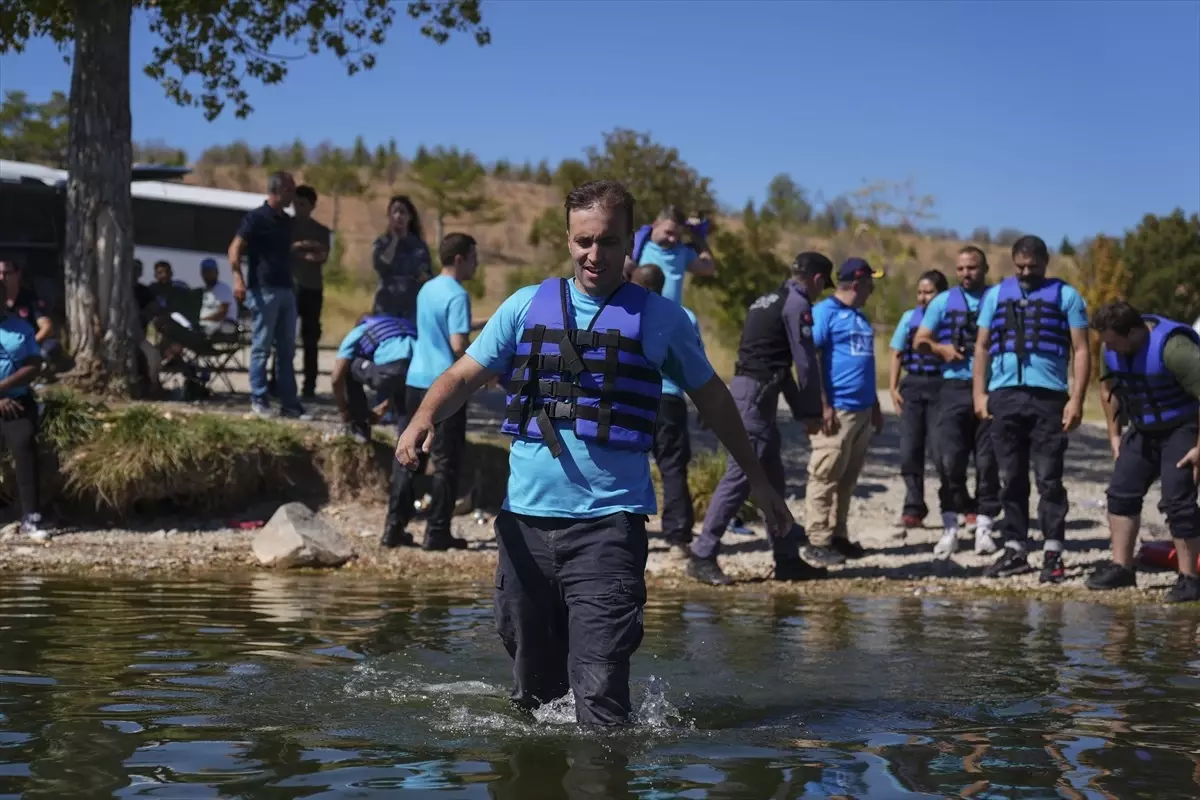 Teorik bilgilendirmenin ardından kursiyerler baraj gölüne girerek görev sırasında suya düştüklerinde nasıl kurtulacaklarına dair pratik yaptı.