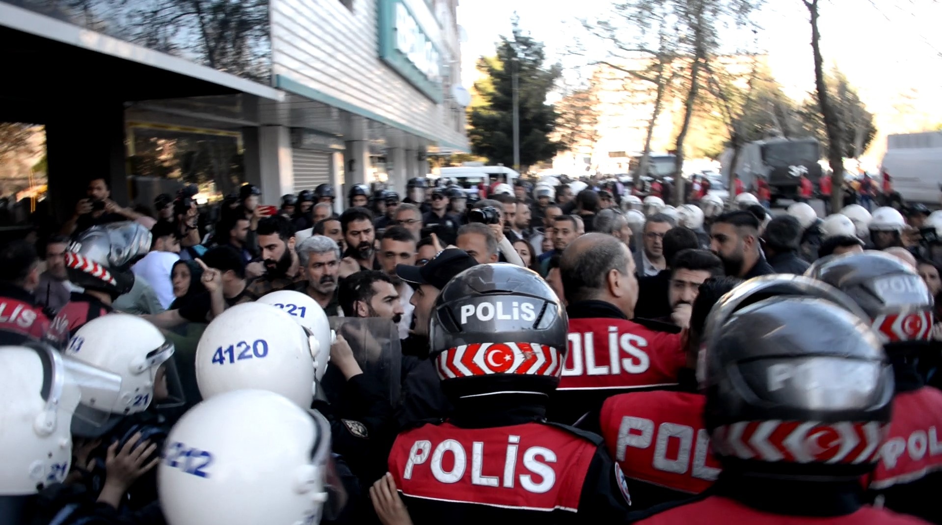 Van’da İl Seçim Kurulunun DEM Parti’den Büyükşehir Belediye Başkanı seçilen Abdullah Zeydan hakkındaki kararının ardından parti binası önünde toplanan kalabalık, yürüyüş yapmak istedi.