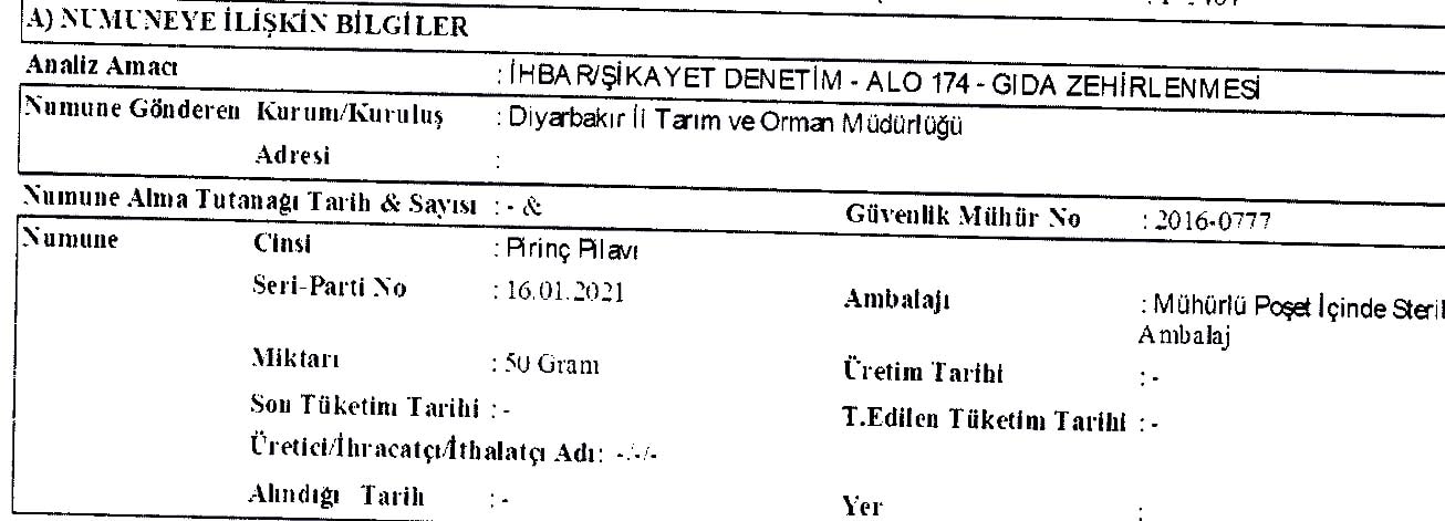 Laboratuvarda yapılan tahlillerde pilavda “Bacillus cereus” bakterisi tespit edildi. Pilavın Türk Gıda Kodeksine aykırı olduğu rapor edilince gözaltına alınan EFEM-İçkale Yemek Firmasının sahibi Yılmaz Öz hakkında, “Kişilerin hayatını ve sağlığını tehlikeye sokacak gıdalar üretmek” suçundan dava açıldı. Tarım Orman İl Müdürlüğü de davada müşteki olarak yer aldı.