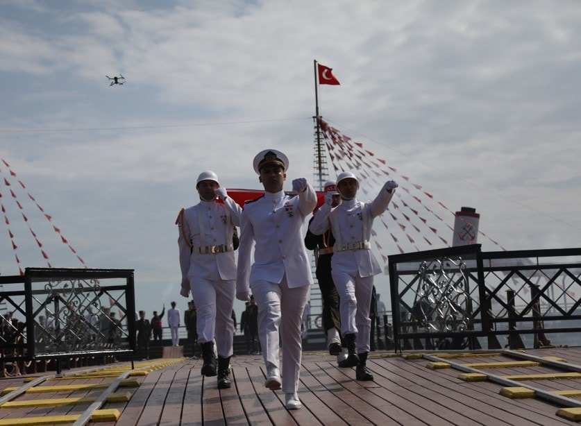 Saygı duruşunda bulunulması ve İstiklal Marşı’nın okunmasıyla başlayan törende, Atatürk’ün 19 Mayıs 1919’da karaya çıkışını sembolize eden Türk bayrağı, 1 deniz subayı, 2 deniz eri ve 2 piyade askeri tarafından taşınıp, karaya çıkarıldı.